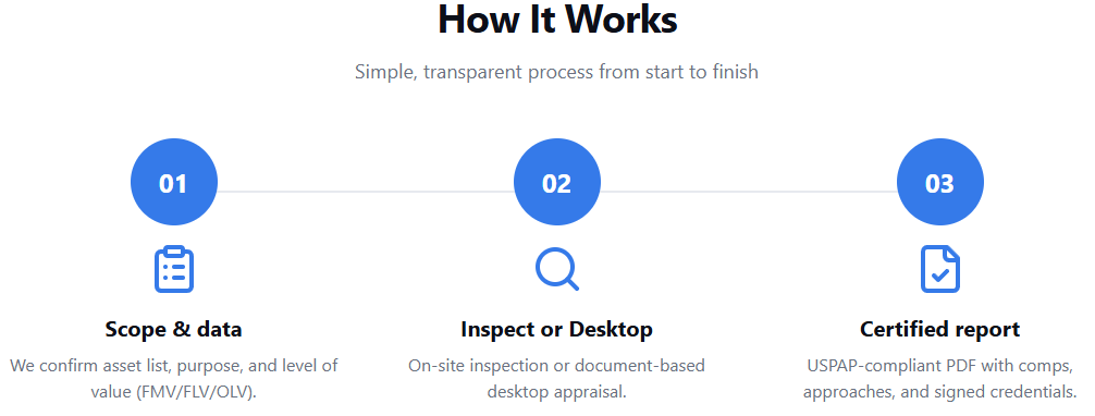 We use market, cost, and (when applicable) income approaches. Values are clearly labeled as FMV (Fair Market Value), FLV (Forced Liquidation Value), or OLV (Orderly Liquidation Value).